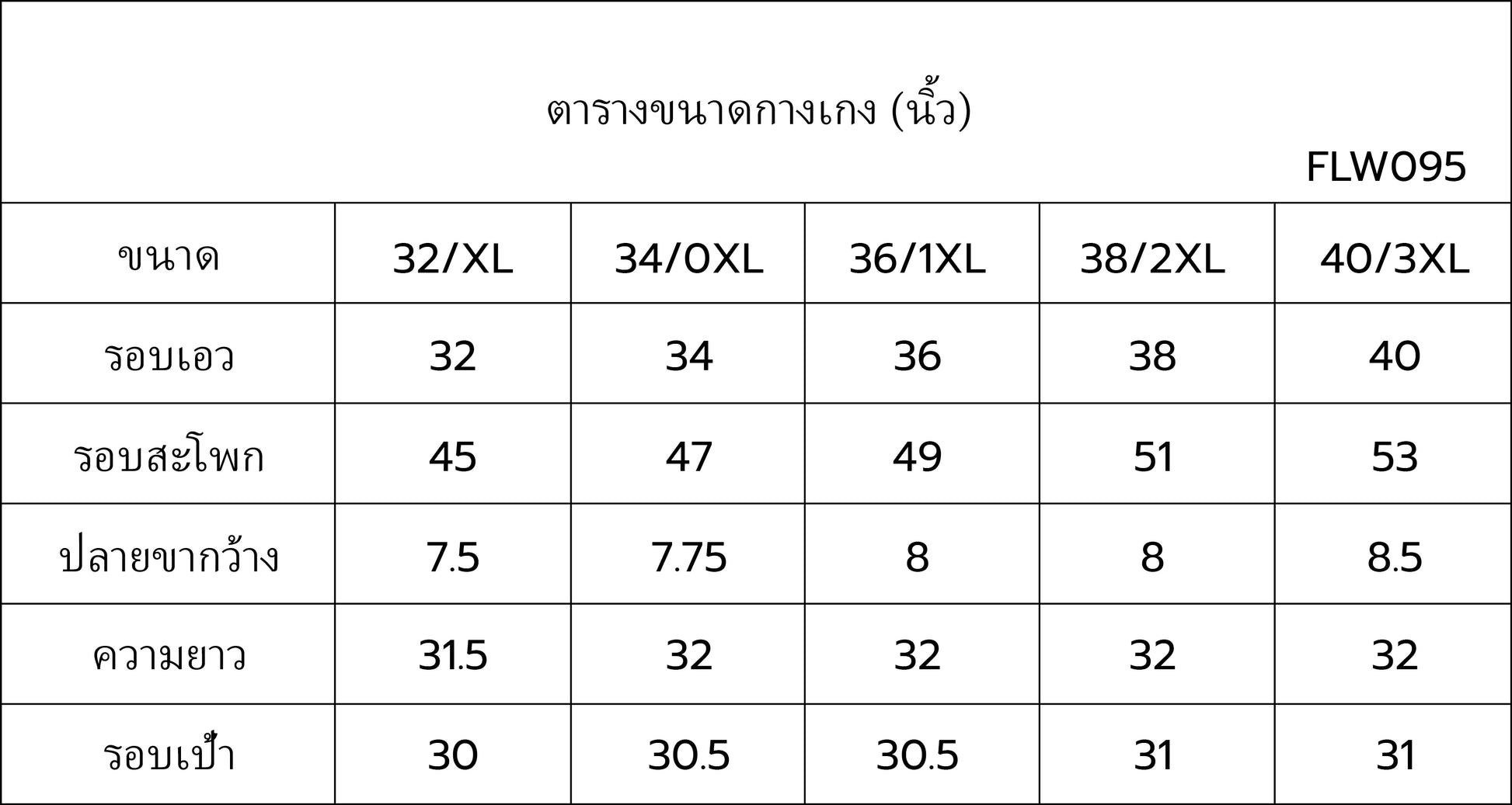 ตารางขนาดกางเกง (นิ้ว)